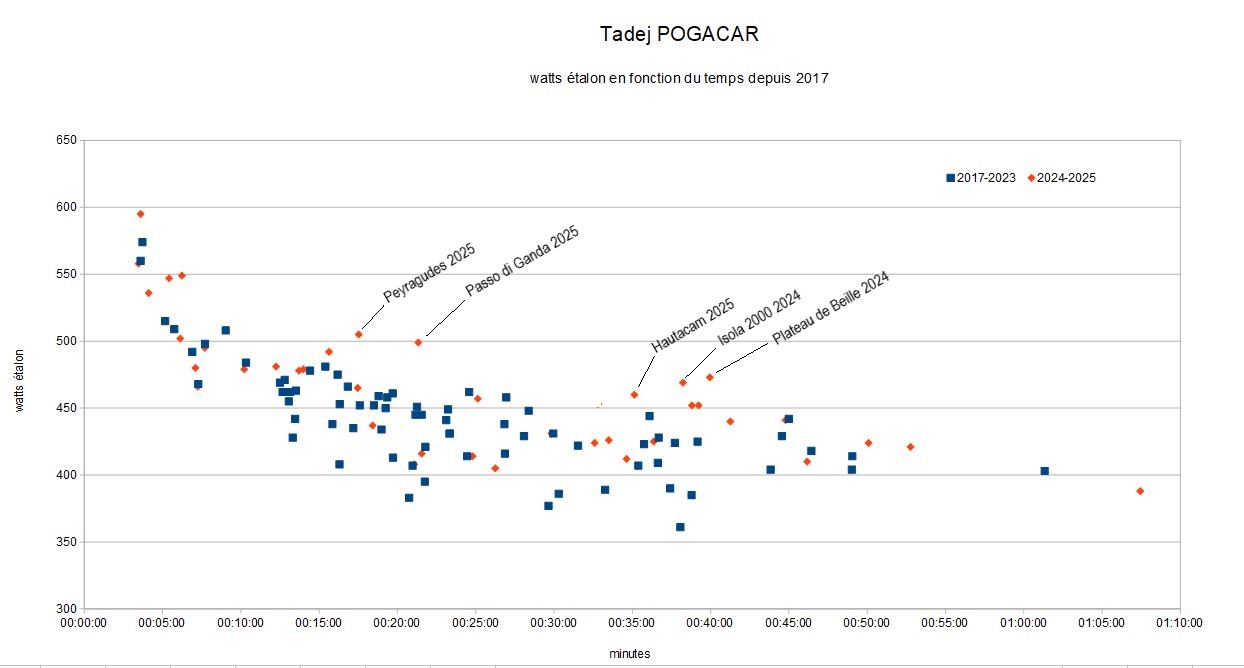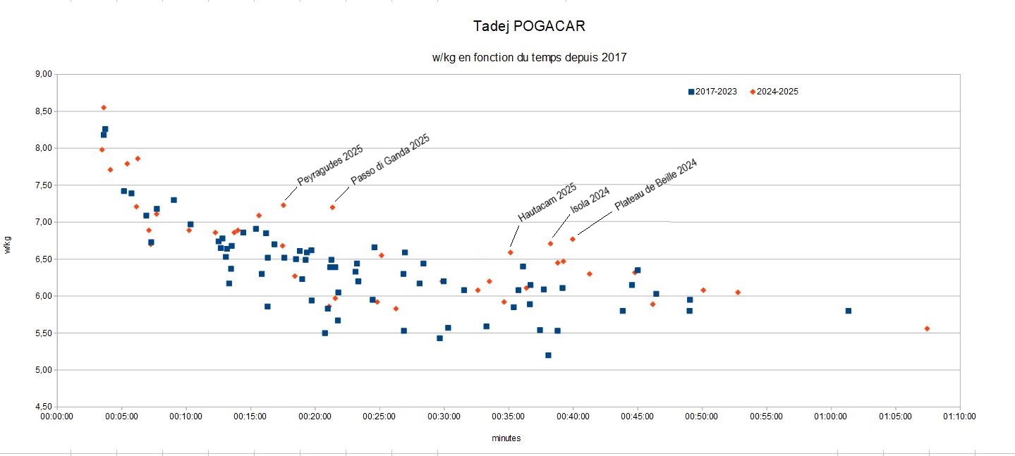 Le Slovène réalise encore une performance extraordinaire sur le Passo di Ganda, à peu près la même puissance qu'à Peyragudes sur le contre-la-montre du Tour de France (effort de 23min). Il restait 30km à parcourir au sommet donc Pogacar ne pouvait pas monter au maximum de ses possibilités le col Italien, contrairement à Peyragudes. D'autre part, sur un grand Tour, il faut être capable de bien récupérer des efforts des jours précédents alors qu'une course d'un jour s'aborde avec plus de fraîcheur. La performance de Pogacar sur le Passo di Ganda fait partie de ses meilleures performances en montagne comme le montre les deux profils de puissance record ci-dessous. Ses performances maximales depuis 2024 apparaissent nettement au dessus de qu'il pouvait réaliser auparavant.