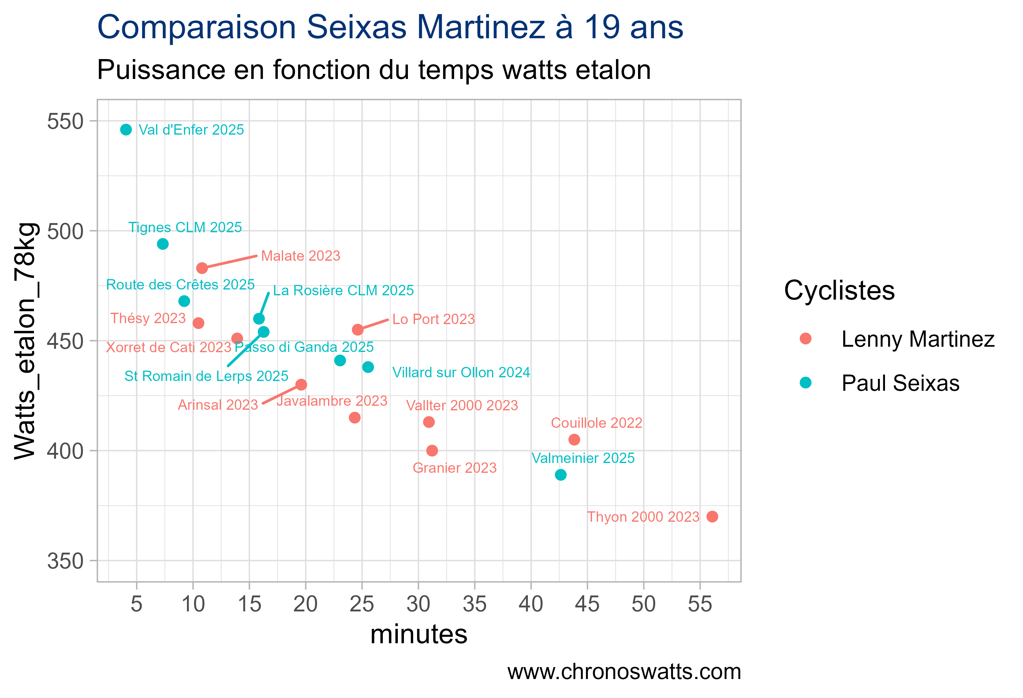 Paul Seixas fait parler de lui à 19 ans. Après une victoire sur le Tour de l'Avenir, il fait déjà bonne figure sur des courses de niveau World Tour : 3ème du championnat d'Europe et 7ème du Tour de Lombardie. Est-il plus fort au même âge en montagne que notre autre « pépite » Lenny Martinez ? Un graphique des performances réalisées à 19ans par Seixas et de Martinez en watts étalon en fonction du temps est proposé.