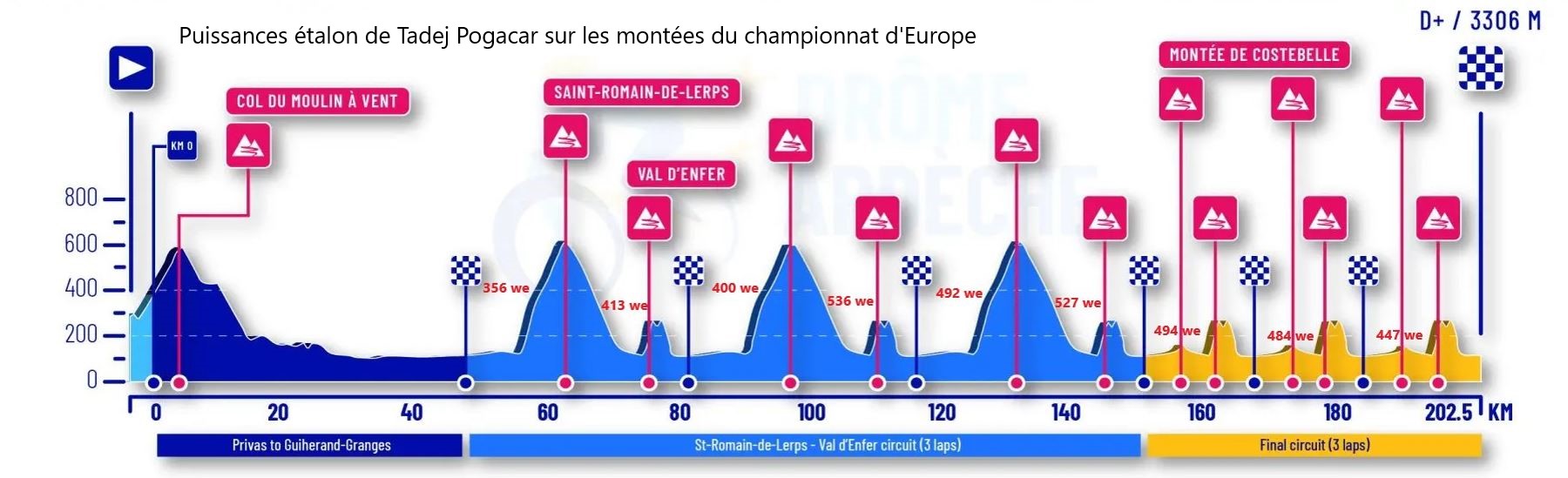 Le parcours très sélectif de ce championnat d'Europe avec la côte de St Romain de Lerps à trois reprises et celle du Val d'Enfer à six reprises a certainement avantagé le Slovène. La course entre les leaders a vraiment débuté dans la deuxième ascension de Saint Romain de Lerps (6,48 km à 7,48%) à 110 km de l'arrivée quand l'équipe belge de Remco Evenepoel a provoqué une première sélection avec un rythme soutenu de 400 watts étalon (5,6 à 5,9 w/kg suivant les coureurs) pendant 18min. La sensation fut le décrochage de Jonas Vingegaard qui suit d'habitude facilement des intensités proches de 6 w/kg. Puis quelques kilomètres plus loin, Evenepoel a accéléré franchement dans la montée du Val d'Enfer. Au sommet, seuls Pogacar et Paul Seixas ont pu rester dans sa roue. Le Belge a gravi cette 2ème montée du Val d'Enfer (1,5 km à 10,47%) en 4min07sec avec une puissance moyenne de 540 watts étalon (7,8 w/kg). Paul Seixas a fait 2 secondes de moins car il était moins bien placé au pied de la montée. Mais les trois hommes ont été repris dans la descente.