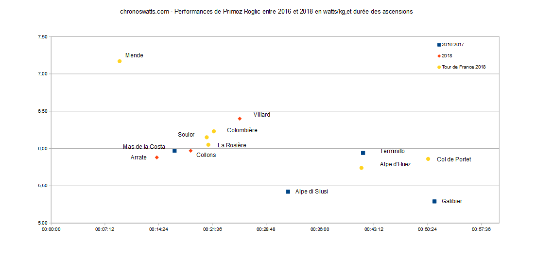 Roglic a très certainement franchi un cap cette année en montagne. Mise à part son ascension du Galibier, c'est la première fois qu'il réalise de grandes performances en montagne sur des Grand Tours. C'est aussi la première fois qu'il obtient un bon classement général sur une épreuve de 3 semaines, cela démontre des progrès dans les domaines de l'endurance et de la récupération. Le contre la montre en côte du Tour de Romandie a révélé son potentiel 2018. Sa progression apparaît nette entre 2017 et 2018 pour des efforts de 20 à 30 minutes en côte. Mais en raison du manque de données en 2017, il ne m'est pas possible de chiffrer avec précision cette progression. Avant 2018, Roglic a remporté de belles victoires en contre la montre. Ses aptitudes physiques pour le cyclisme doivent être bien au dessus de la moyenne.